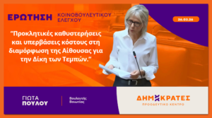 Μετά τις σοβαρές ελλείψεις που διαπιστώθηκαν κατά την πρώτη συνεδρίαση της δίκης των Τεμπών στις 23 Μαρτίου 2026 στην αίθουσα του Συνεδριακού Κέντρου ΓΑΙΟΠΟΛΙΣ και τις ντροπιαστικές για τη δικαιοσύνη εικόνες ασφυξίας, ανεπάρκειας χώρου για συγγενείς θυμάτων και δικηγόρων, που οδήγησαν στη διακοπή της δίκης, κατέθεσα σήμερα Ερώτηση & Αίτηση Κατάθεσης Εγγράφων προς τους Υπουργούς Δικαιοσύνης και Εσωτερικών με τη συνυπογραφή των βουλευτών, μελών των Δημοκρατών -ΠΚ.